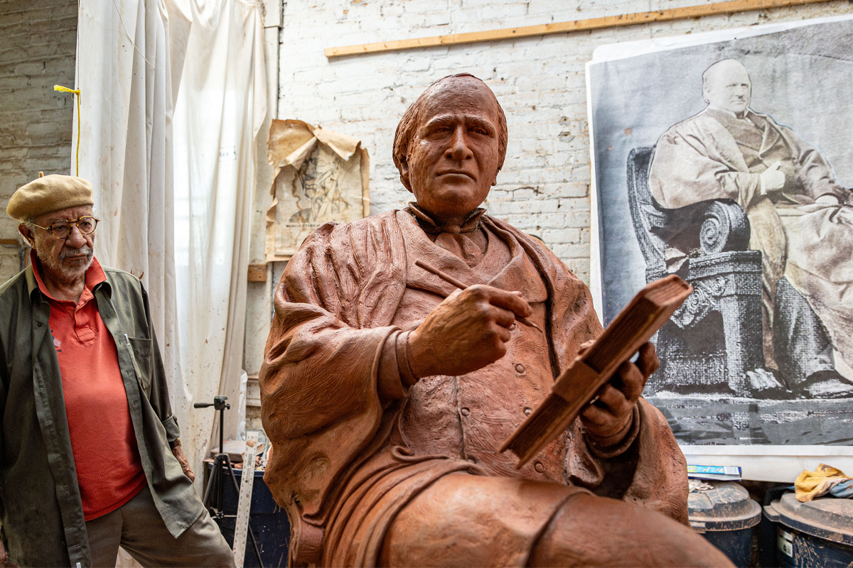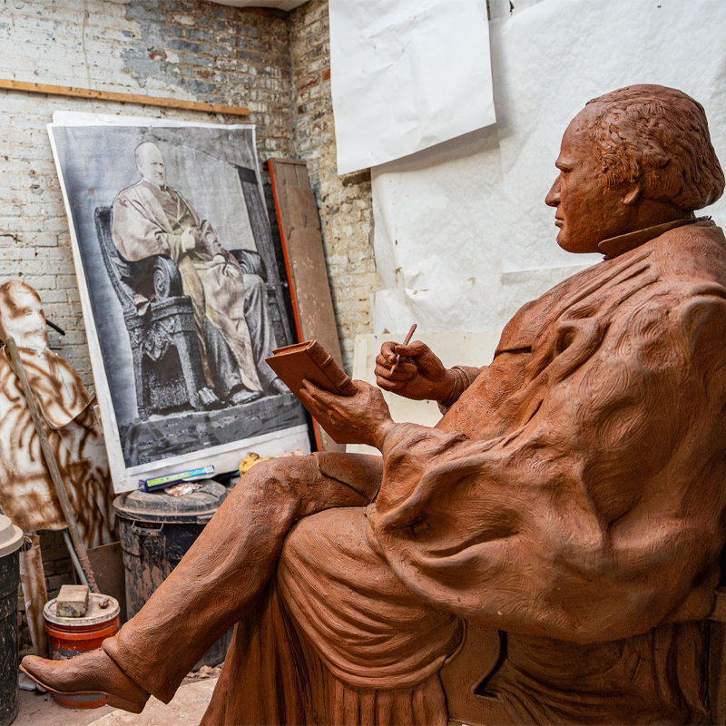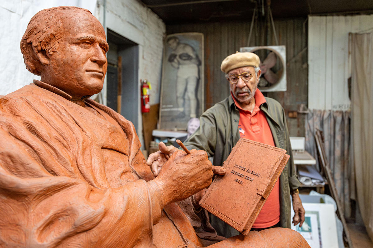 Ed Hamilton is a Louisville-native sculptor whose powerful public monuments explore African American history and American identity. He began his career in painting and liturgical work before apprenticing with sculptor Barney Bright. A breakthrough Booker T. Washington commission led to major works, including The Spirit of Freedom (a memorial to Black Civil War veterans in Washington, D.C.), a 12-foot Joe Louis in Detroit, the Abraham Lincoln statues in Louisville’s Waterfront Park and at Centre College (installed 2012), and this likeness of Justice John Marshall Harlan. Hamilton centers representation, especially for children of color, in work that has earned him national recognition, museum retrospectives, and honorary doctorates.